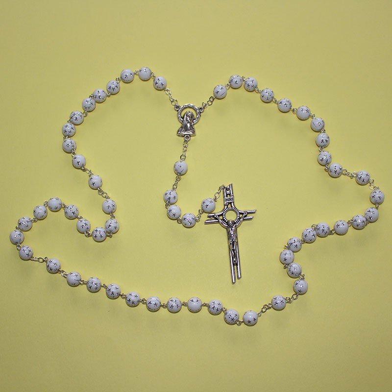 Rosario con cuentas en forma de estrella de color blanco. Tamaño de las cuentas: 8 mm. Longitud total: 55,5 cm.
