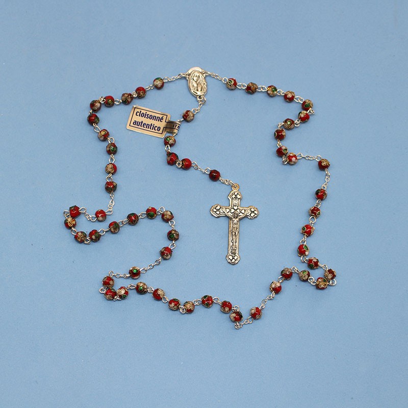 Rosario elaborado con cuentas cloisonné en color rojo. Tamaño de las cuentas: 6 mm. Longitud total: 41,5 cm.