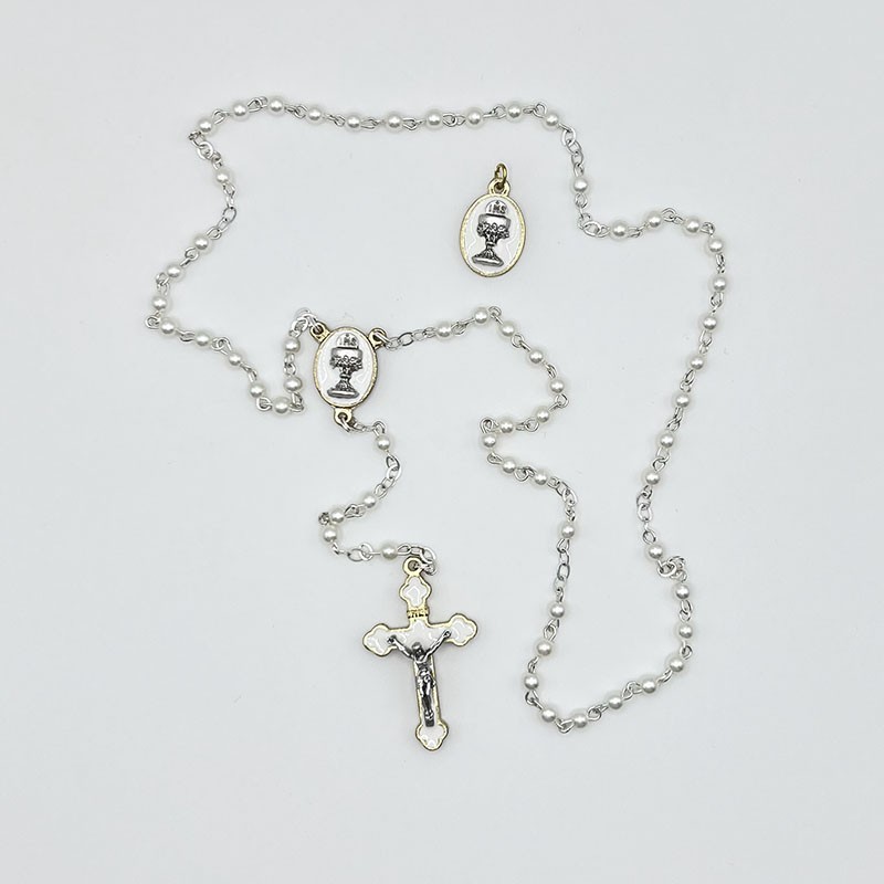 Caja de Primera Comunión con rosario y medalla con cáliz en perla. Diseño elegante y simbólico.