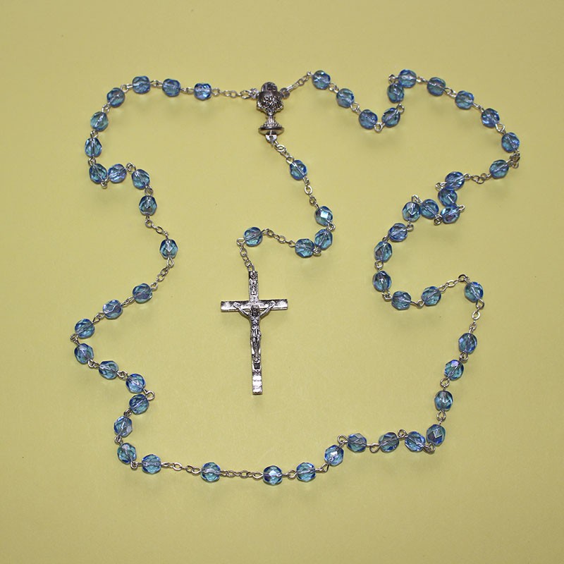 Este elegante rosario de cristal facetado con cáliz azul combina brillo, simbolismo y devoción en un diseño refinado. Las cuentas de cristal facetado de 6 mm reflejan la luz de manera especial, creando destellos que aportan luminosidad y belleza a la pieza.