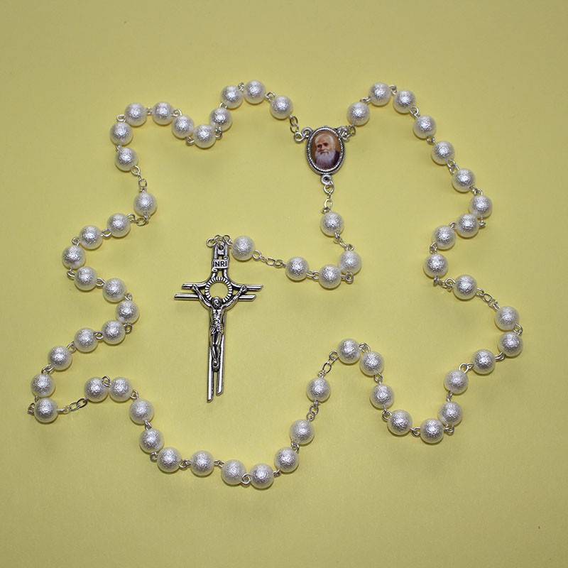 Rosario de perla acrílica con cuentas de 8 mm y misterios metálicos. Longitud total: 52,5 cm.