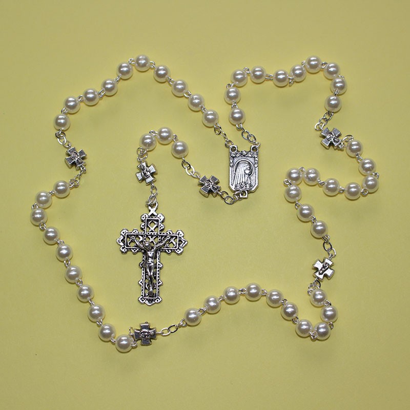 Rosario de perla acrílica con cuentas de 5 mm, misterios metálicos y cruz blanca. Longitud total: 40,5 cm.