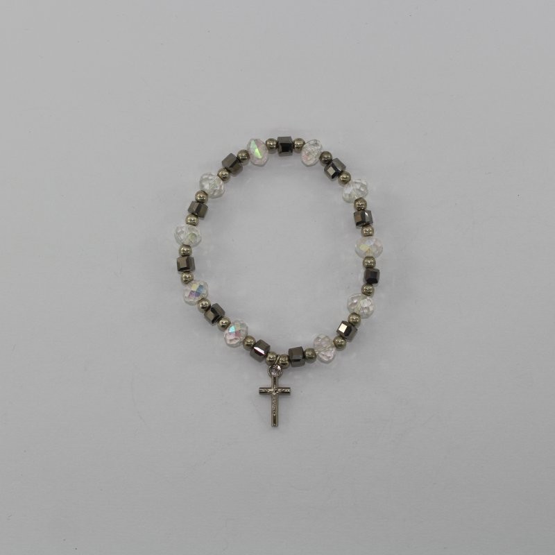 Esta pulsera de cristal en forma de cubo plateada destaca por su elegancia, su brillo luminoso y su moderno acabado geométrico. Está elaborada con cuentas de cristal en forma de cubo, que aportan un estilo distintivo y sofisticado, reflejando la luz de manera sutil y refinada.