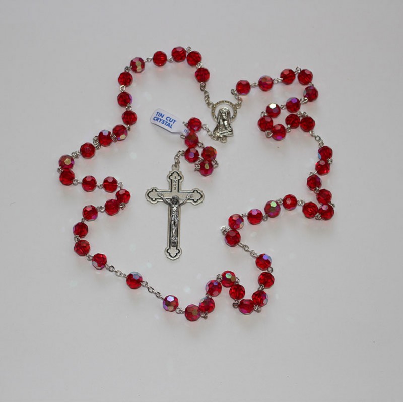 Rosario de cristal facetado 32 fases en color rojo. Cuentas de 8 mm. Longitud total: 54 cm.