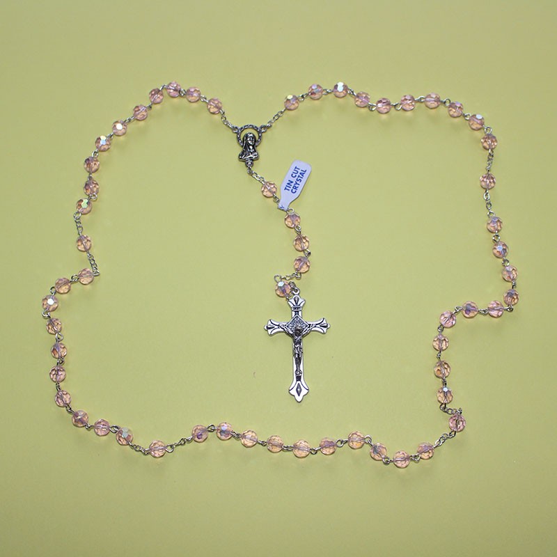 Rosario de cristal facetado 32 fases en color rosa. Cuentas de 6 mm. Longitud total: 46,5 cm.