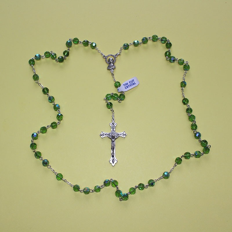 Rosario de cristal facetado 32 fases en color verde. Cuentas de 6 mm. Longitud total: 46,5 cm.