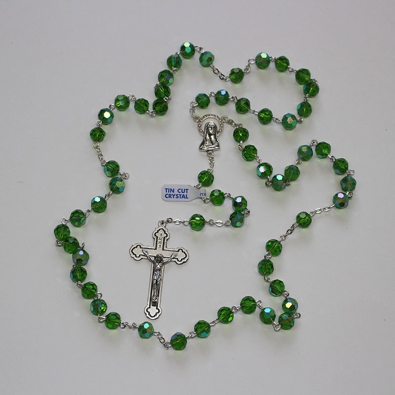 Rosario de cristal facetado 32 fases en color verde. Cuentas de 8 mm. Longitud total: 54 cm.