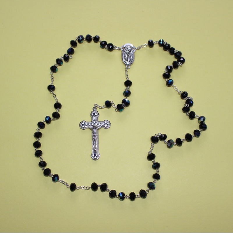 Este rosario de cristal facetado AB negro destaca por su elegancia, brillo profundo y toque contemporáneo. Elaborado con cuentas de cristal facetado AB de 8x9 mm, ofrece reflejos iridiscentes que realzan su color oscuro, aportando una luminosidad sobria y sofisticada a cada oración.
