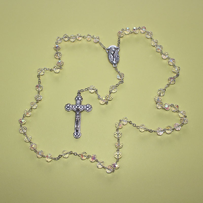 Este rosario de cristal facetado AB transparente destaca por su pureza, brillo iridiscente y elegancia atemporal. Fabricado con cuentas de cristal facetado AB de 8x9 mm, produce un hermoso efecto de reflejos multicolores que cambian con la luz, aportando luminosidad y serenidad a cada oración.