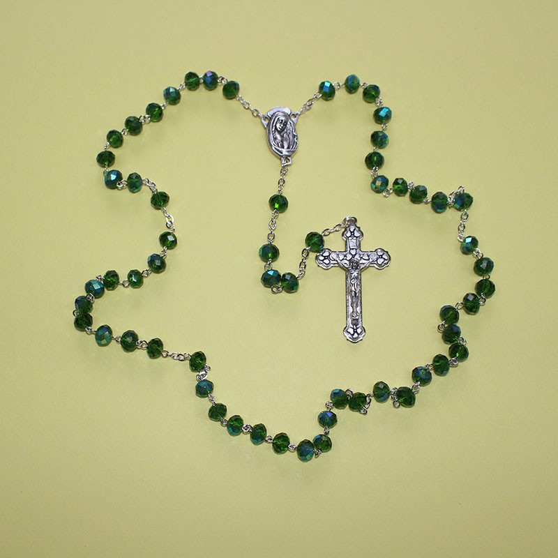 Este rosario de cristal facetado AB verde combina brillo, color y simbolismo espiritual en una pieza elegante y luminosa. Elaborado con cuentas de cristal facetado AB de 8x9 mm, produce reflejos iridiscentes que realzan su tono verde, asociado a la esperanza, la renovación interior y la armonía espiritual.