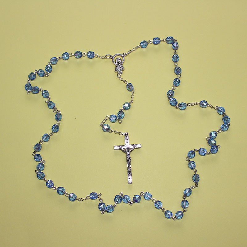 Este rosario de cristal facetado azul combina elegancia, serenidad y un brillo delicado que lo convierte en una pieza devocional muy especial. Elaborado con cuentas facetadas de 6 mm, refleja la luz con destellos suaves que evocan calma, fe y armonía espiritual. El color azul simboliza paz interior, confianza y esperanza.