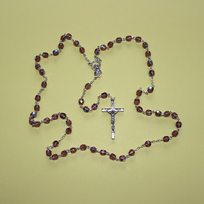 Rosario de cristal facetado lila. Cuentas de 6 mm. Longitud total: 47 cm.
