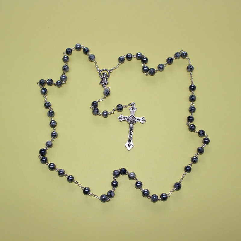Este rosario de cristal nacarado gris destaca por su elegancia sobria, su brillo perlado y su refinado simbolismo espiritual. Está elaborado con cuentas de cristal nacarado de 6 mm, que ofrecen un acabado suave y luminoso, aportando serenidad y equilibrio a la oración diaria.