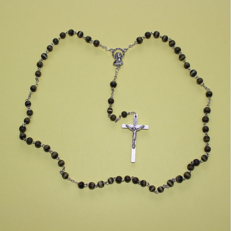 Rosario con cuentas ojo de gato marrones de 5 mm. Longitud total: 39 cm.