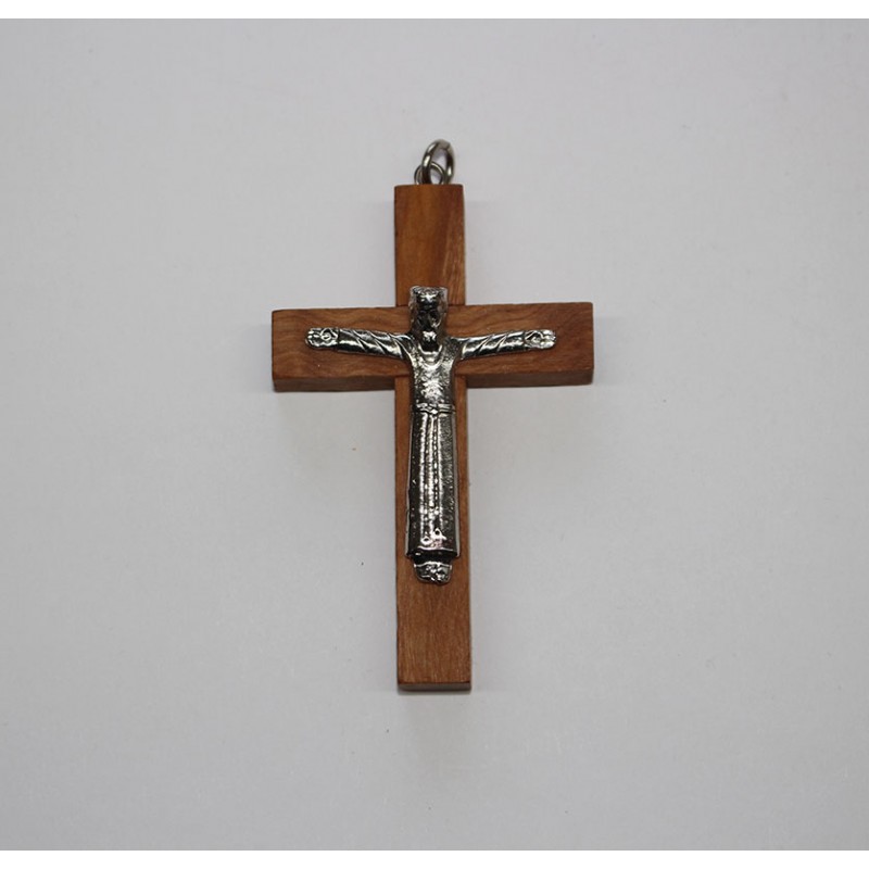 Cruz de madera de olivo con Cristo románico tallado. Medida: 6,5 x 4,3 cm.