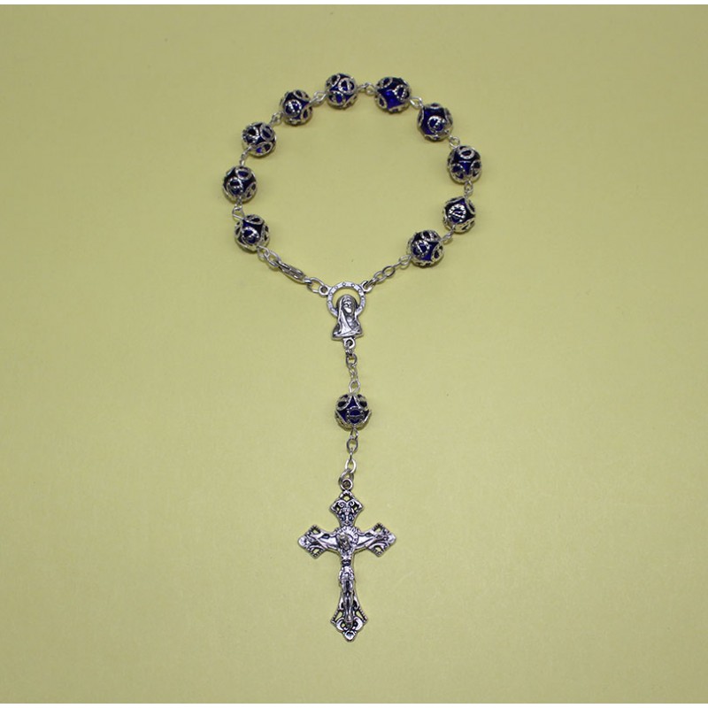 Esta décima de cristal con copete azul es un accesorio religioso práctico y elegante, ideal para llevar siempre consigo. Se trata de un rosario abreviado de un misterio, formado por 10 cuentas de cristal facetado de 8 mm, con un diseño compacto y ligero.