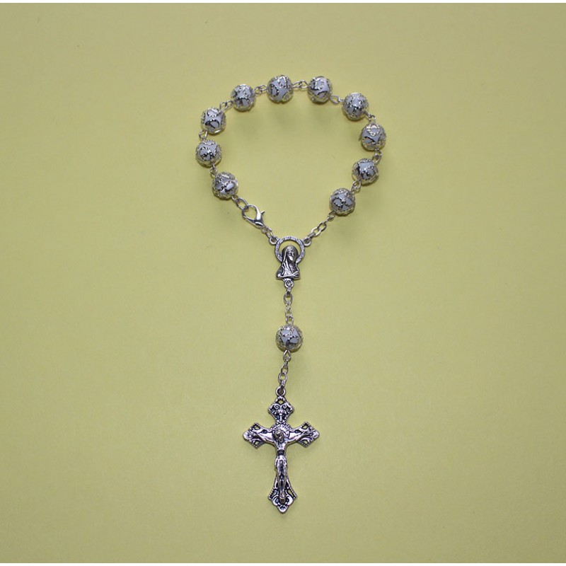Esta décima de cristal con copete blanco es un accesorio religioso elegante y práctico, ideal para quienes desean un rosario compacto y fácil de llevar. Se trata de un rosario abreviado de un misterio, compuesto por 10 cuentas de cristal facetado de 8 mm, que aportan brillo y ligereza.