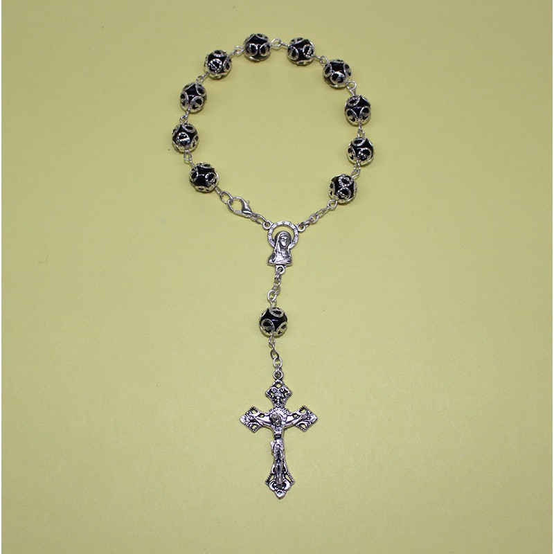 El copete negro le da un toque distintivo y serio, ideal para quienes valoran un estilo más discreto. Con una longitud total de 18 cm, es un rosario de bolsillo muy cómodo, que también puede usarse como pulsera, pensado para acompañar la oración personal en cualquier lugar.