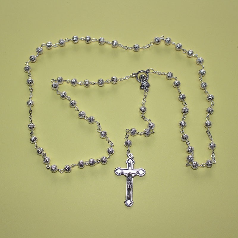 Este rosario de filigrana es una pieza artesanal que destaca por su elegancia y ligereza. Sus cuentas de 6 mm, trabajadas en diseño calado de filigrana, le otorgan un acabado delicado, brillante y muy especial, ideal para quienes buscan un rosario con un estilo distinguido y refinado.