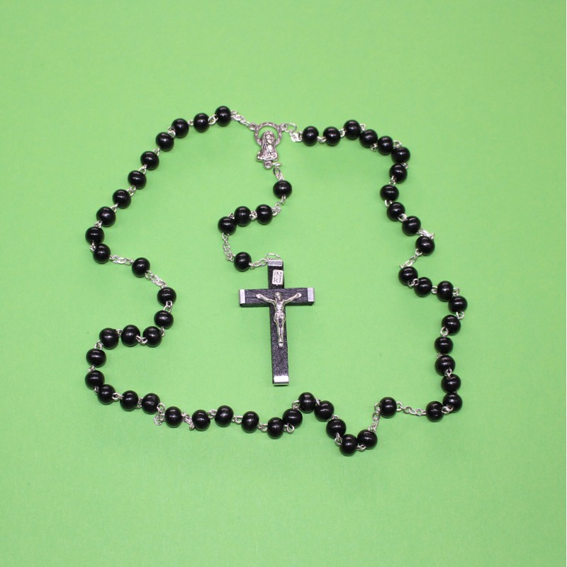 Rosario de madera redonda negra con cuentas de 7 mm. Longitud total: 46 cm.