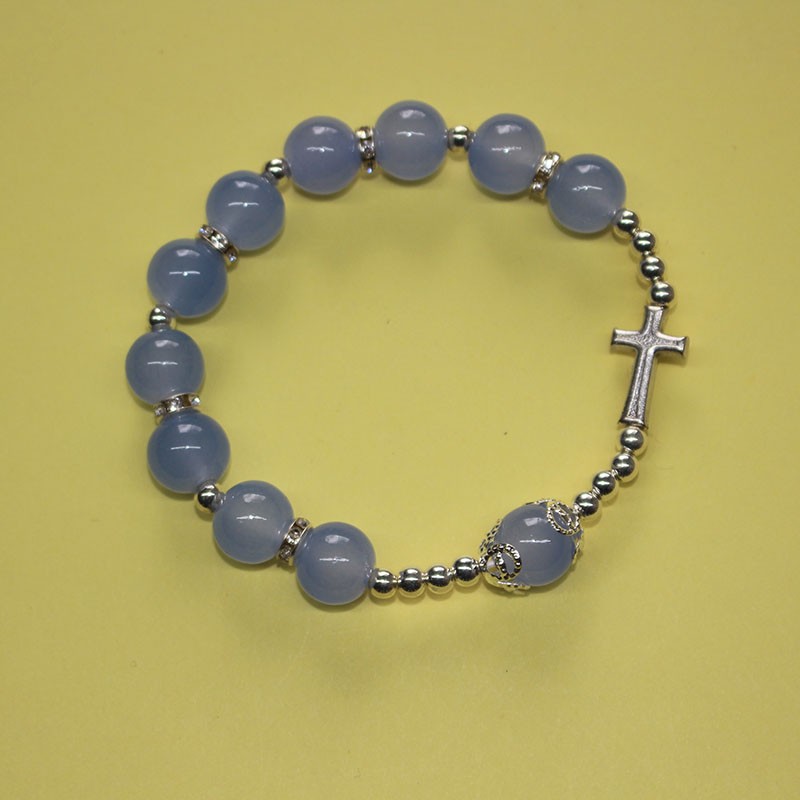 Pulsera elástica tipo perla con cruz de metal celeste – cuentas de 8 mm