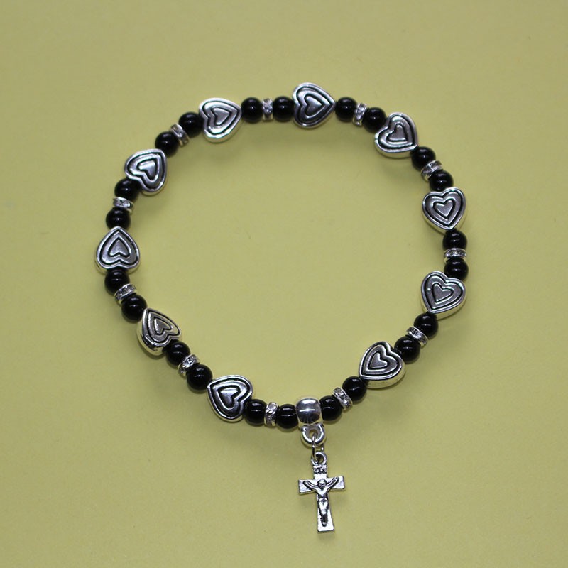 Pulsera elástica con cuentas negras de 5 mm, corazón metálico central y detalles de cristal brillante.