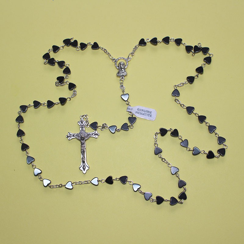 Este elegante rosario de hematite en forma de corazón ha sido elaborado artesanalmente con piedras naturales, ofreciendo un diseño único que combina simbolismo y belleza. El hematite, reconocido por su brillo metálico y sus propiedades asociadas a la fortaleza y la protección, aporta a este rosario un estilo sobrio y especial.