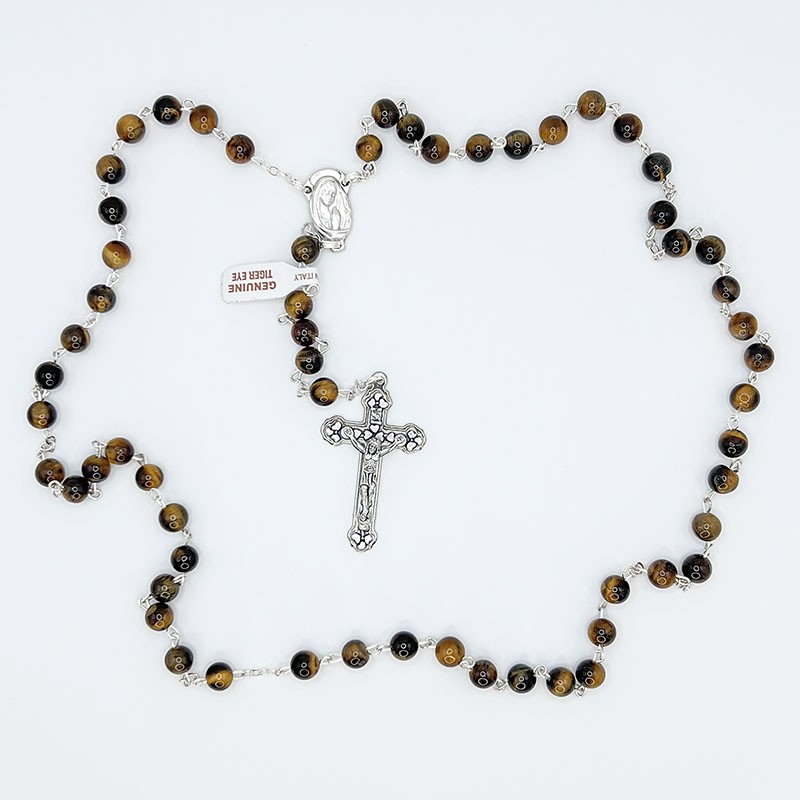 Este rosario mineral ojo de tigre destaca por su belleza natural, su brillo característico y su profundo simbolismo espiritual. Está elaborado con cuentas de piedra mineral de 6 mm, que presentan los tonos cálidos y los reflejos únicos propios del ojo de tigre, aportando personalidad y elegancia a cada pieza.