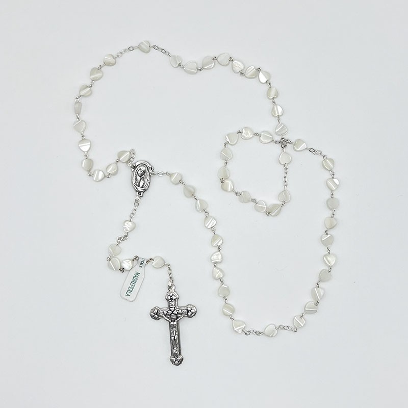Rosario artesanal elaborado con cuentas de nácar auténtico en forma de corazón. Medida de las cuentas: 5,5 x 6,5 mm. Longitud total: 46,8 cm.
