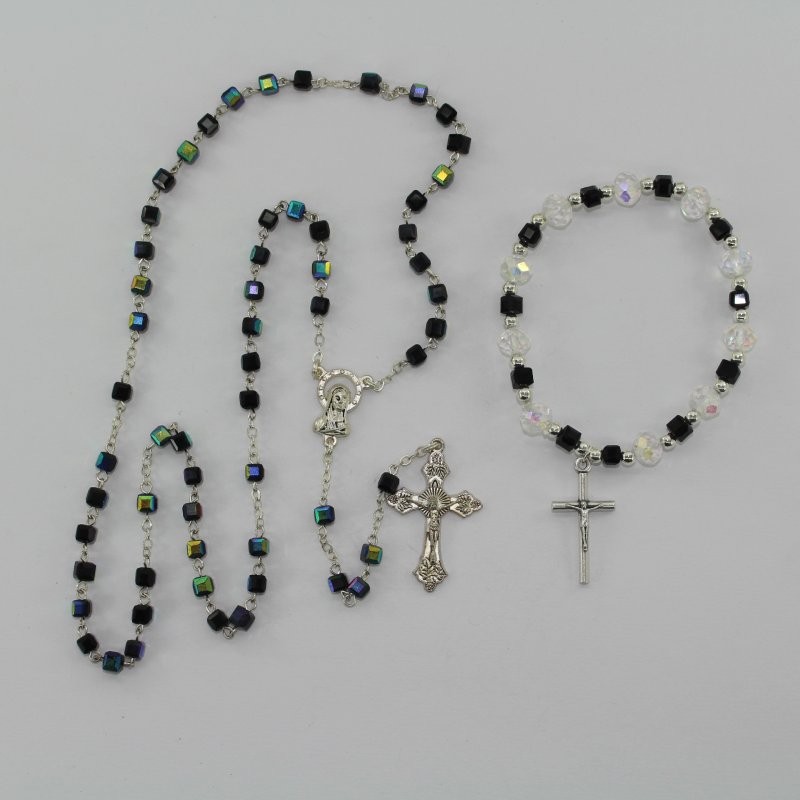 Pack con pulsera y rosario de cristal en forma de cubo a elegir en color dorado, plateado o negro. Diseño elegante y moderno.