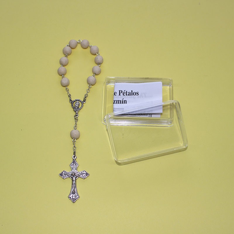 Rosario artesanal de un solo misterio, elaborado con pétalos de jazmín prensados. Cuentas de 7 mm y longitud total de 14,5 cm. Incluye caja de presentación y folleto histórico.